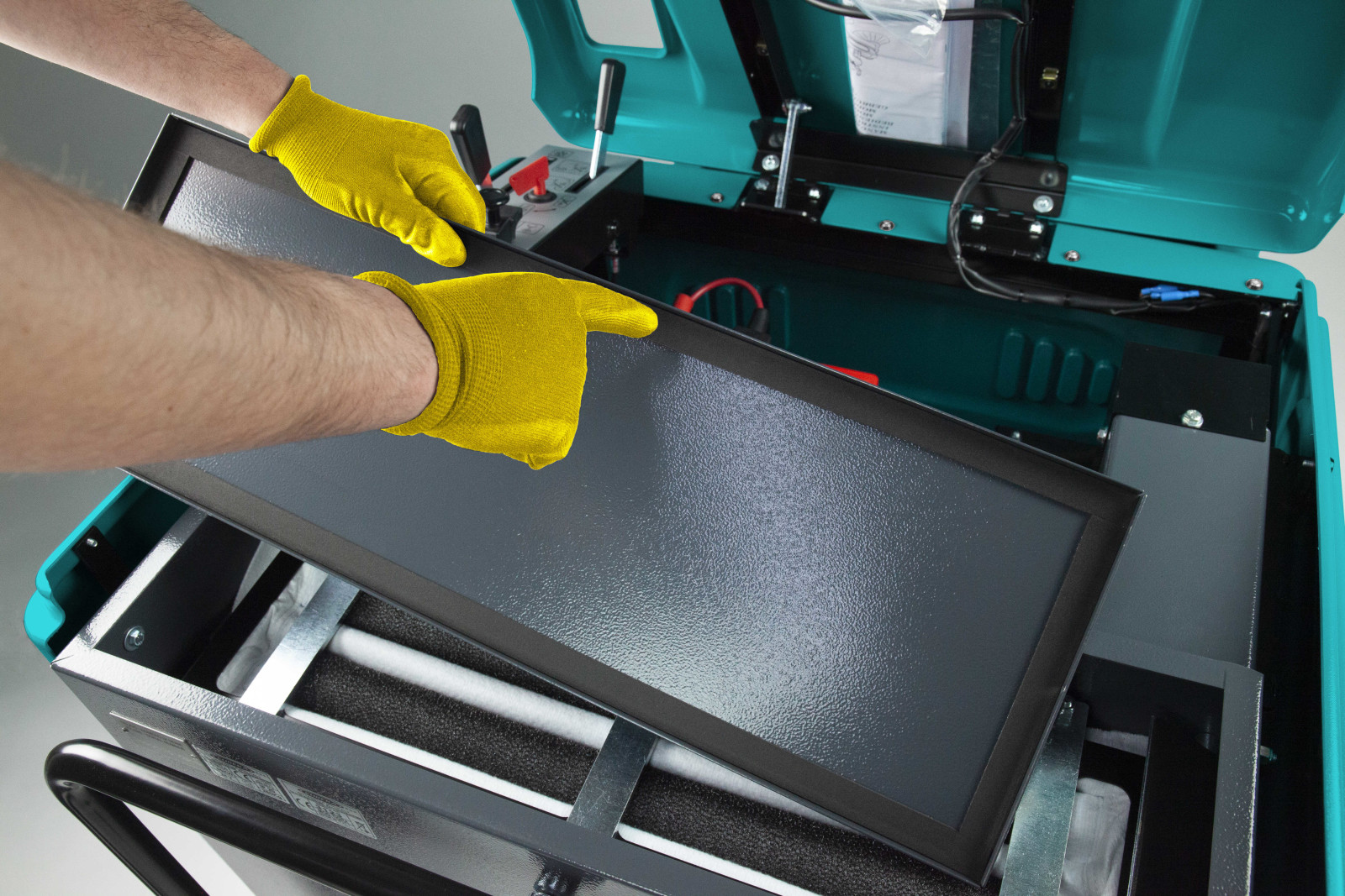 Son capot supérieur s’ouvre entièrement, facilitant l’accès à la batterie et aux composants internes pour un entretien simple et rapide. Avec une largeur de nettoyage jusqu’à 1 055 mm et une productivité de 5 800 m²/h, la Tigra allie productivité, maniabilité et durabilité, idéale pour les environnements intérieurs exigeants.