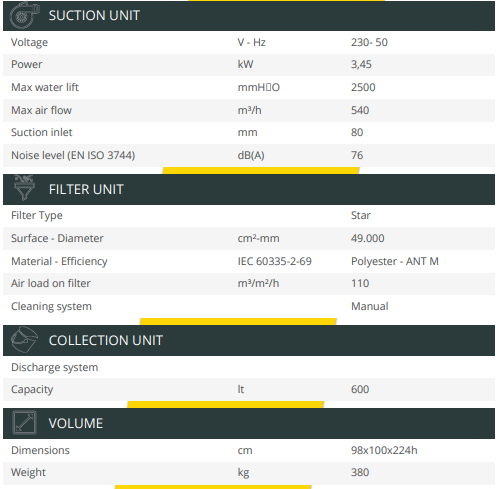 Le VS600 est un séparateur sous vide doté d’une capacité de collecte extrêmement importante, adapté à l’aspiration de matériaux solides. Sa particularité est qu’il est prêt pour les chariots élévateurs, ce qui signifie que le séparateur peut être soulevé et que le contenu aspiré peut être évacué directement en ouvrant la trappe avant avec un levier de sécurité.