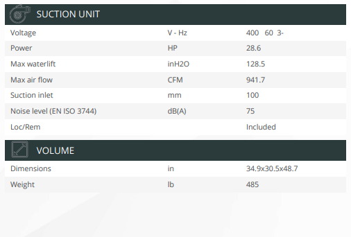 Le CV120 est l’une des unités d’aspiration les plus puissantes disponibles pour votre système d’aspiration centralisé. Le ventilateur à canal latéral, avec 28,6 HP, 128,5 inH20 et 941,7 CFM, simplifie les opérations quotidiennes de nettoyage de la poussière et des matériaux solides. Le moteur est efficace, fiable et protégé par une armoire insonorisante.