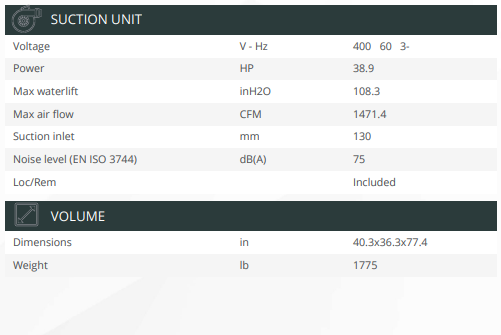 Le CV121 est un ventilateur à canal latéral puissant et fiable protégé par une armoire insonorisante. Dans un système d’aspiration centralisé, cette unité d’aspiration garantit des opérations de nettoyage quotidiennes et intensives efficaces, grâce à ses principales caractéristiques techniques : 38,9 CV, 108,3 inH20 et 1471,4 CFM.
