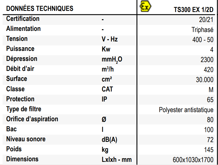 Les TS 300 et 750 1/2D sont les alliés pour aspirer les poussières et les solides dans les zones classées ATEX Z21 en toute sécurité, grâce à la certification intérieure zone 20. Conteneur roulant en acier inoxydable AISI304, filtre antistatique de classe M avec nettoyage manuel et structure sur roues.