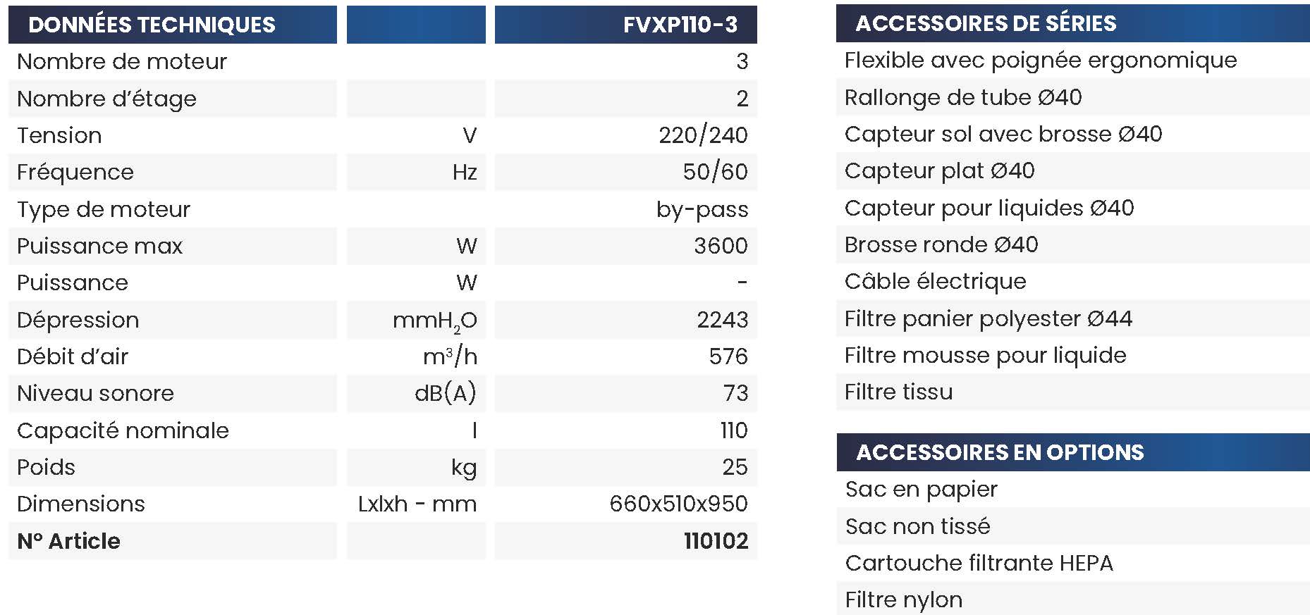 Aspirateur de 110 litres pour l’aspiration de poussières et de liquides à 3 moteurs, idéal pour un usage intensif, où une certaine puissance d’aspiration est requise.