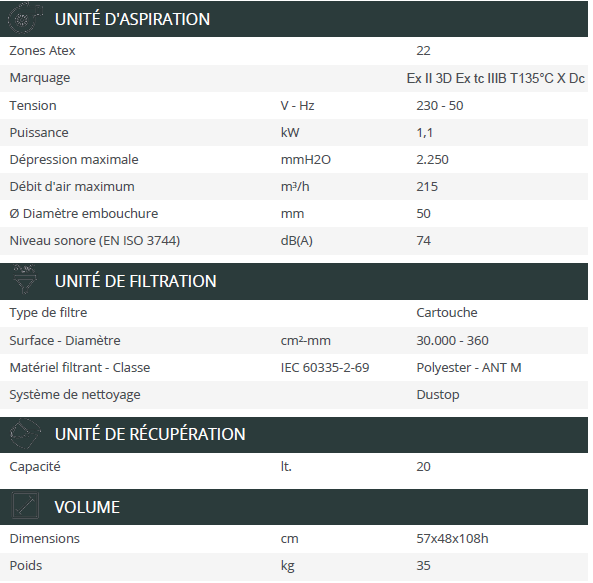 Le M220 BL avec marquage IIID est équipé d'un moteur sans balais qui garantit des performances de haut niveau sans nécessiter d'entretien de routine. Le filtre antistatique de classe M assure une filtration complète de la poussière aspirée.
