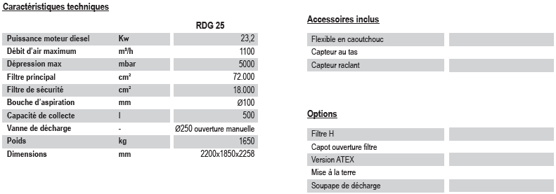 L’aspirateur sur remorque RDG25 est particulièrement adapté à l’aspiration sur les chantiers de sablage, cimenterie, chaudière biomasse, silo, aciérie entre autres afin de pouvoir aspirer rapidement et mettre en big bag le produit aspiré. Equipé d’une trémie d’environ 700 litres il sera possible d’aspirer à plusieurs dizaines voire une centaine de mètre afin de récupérer et conditionner le produit aspiré. Existe en version électrique ou thermique pour zone Atex ou non. Aussi disponible à la location.