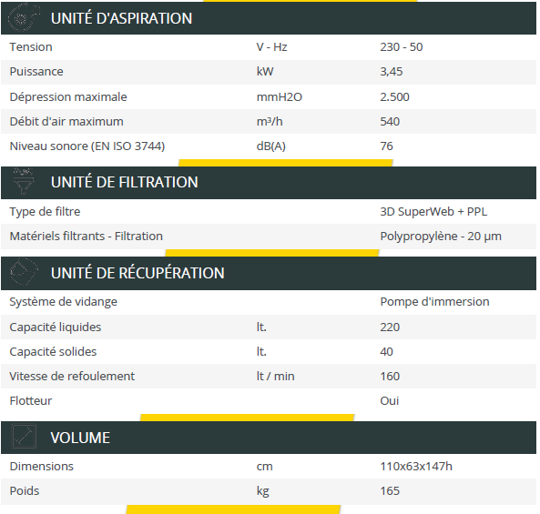 Le réservoir de 220 litres recueille un volume important de matériaux et permet de filtrer les huiles des déchets solides grâce au panier à grille de tamisage situé à l'intérieur, afin de réutiliser les émulsions et d'économiser sur les achats futurs. La pompe immergée permet d'aspirer et d'évacuer les liquides simultanément, ce qui garantit une totale liberté à l'opérateur.
