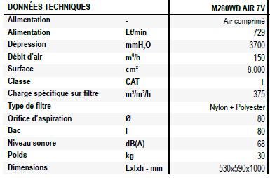 Le 280 WD AIR est l'aspirateur idéal pour aspirer des liquides là où l'électricité n'est pas disponible ou possible. Le moteur à 2 Venturi utilise l'air comprimé disponible pour aspirer jusqu'à 80 litres de liquides, même mélangés à de la poussière, qui peuvent ensuite être évacués en quelques minutes grâce à une valve pratique située à l'arrière.