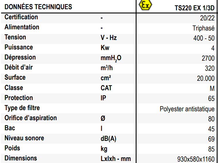 Certifié pour la zone intérieure ATEX 20 et la zone extérieure ATEX 22, le TS 220 1/3D est un aspirateur utilisé pour aspirer en toute sécurité les poussières et les solides dans des atmosphères présentant un risque d'explosion.