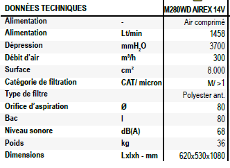 L'aspirateur 280 WXP est l'outil idéal pour aspirer et éliminer les liquides potentiellement explosifs tels que les peintures dans les atmosphères dangereuses classées ATEX dans lesquelles l'utilisation de l'électricité est interdite ou limitée. Alimenté par de l'air comprimé, il est certifié par un tiers pour une utilisation dans les zones 1 et 2 pour les gaz et 21 et 22 pour les poussières.