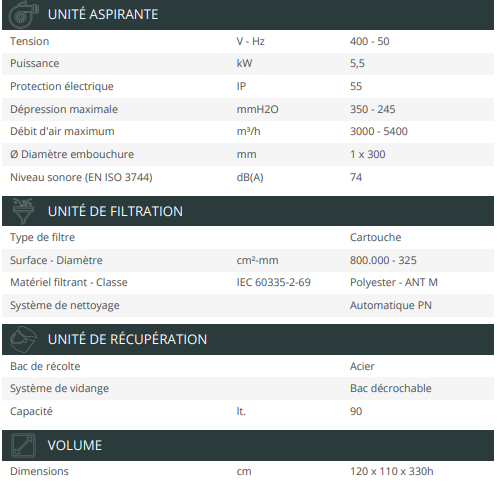 Les poussières aspirées se déposent dans un conteneur (capacité 90lt) monté sur roues, permettant une élimination rapide du matériel.