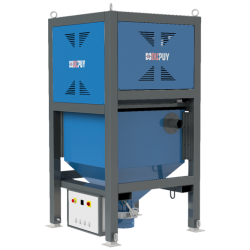 Le matériau aspiré est déposé dans un conteneur trémie en acier (capacité 100 litres), qui permet une évacuation rapide du matériau aspiré sans se salir grâce à la vanne papillon manuelle D150. Le matériau est déchargé directement dans des big-bags fermés avec couvercle.L'aspirateur est monté sur un châssis robuste en acier revêtu de poudre, équipé de roues pivotantes non marquantes avec frein de stationnement.